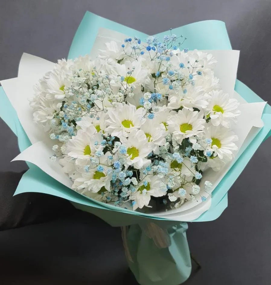 В Данном букете прекрасно сочетается ромашковая хризантема и гипсофила!