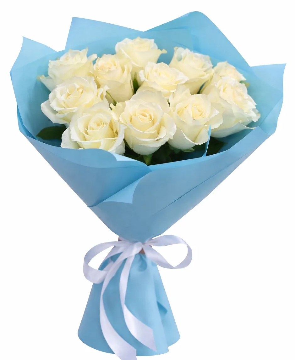 Нежный и утончённый букет из 11 белых роз очаровывает своей чистотой и элегантностью. Белоснежные бутоны символизируют искренность и светлые чувства, а голубая упаковка добавляет композиции свежесть и спокойное, гармоничное настроение.