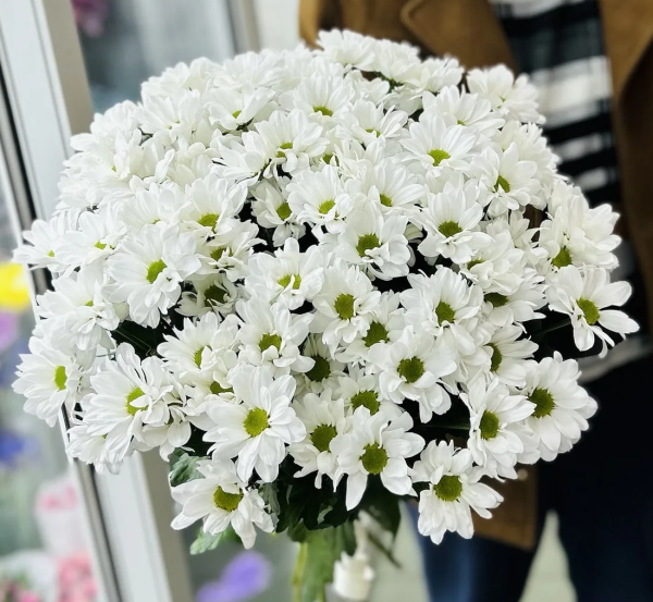 Лёгкий и очаровательный букет из 15 ромашковидных хризантем создаёт атмосферу свежести, уюта и искренних эмоций. Пышные соцветия напоминают маленькие ромашки, наполняя композицию естественной красотой и нежностью.