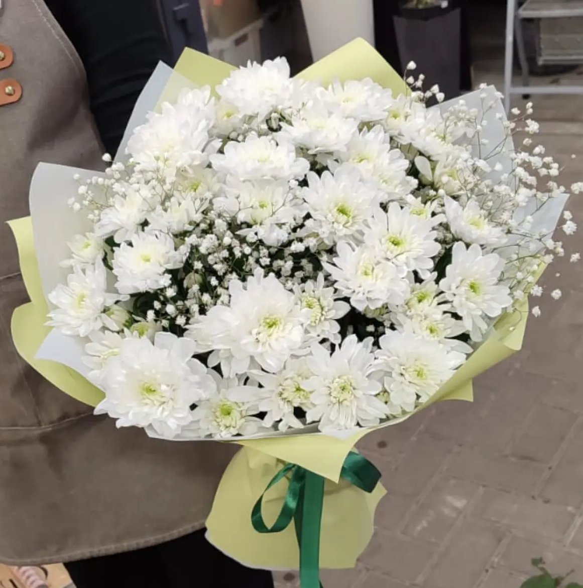 - Стандарт - кустовая хризантема - 5 шт., гипсофила, упаковка, лента