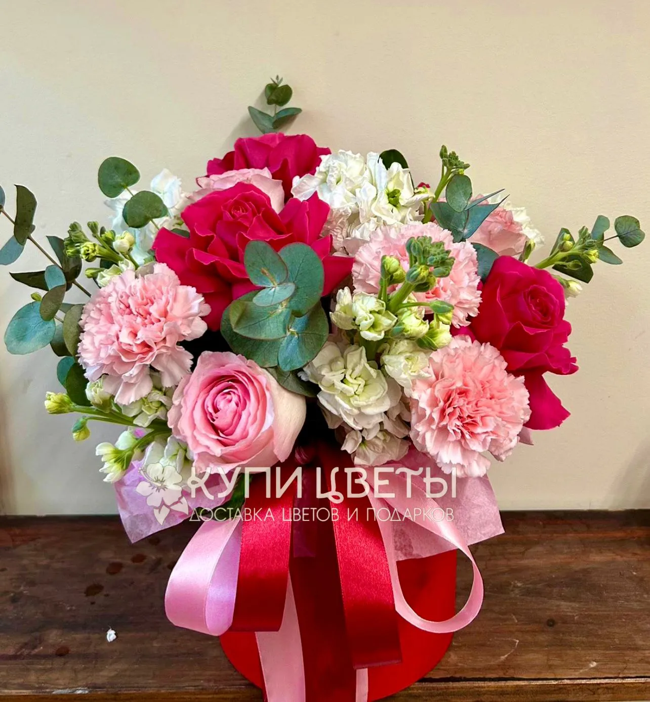 Французкая роза, роза, гвоздика, эвкалипт, шляпная коробка, лента |