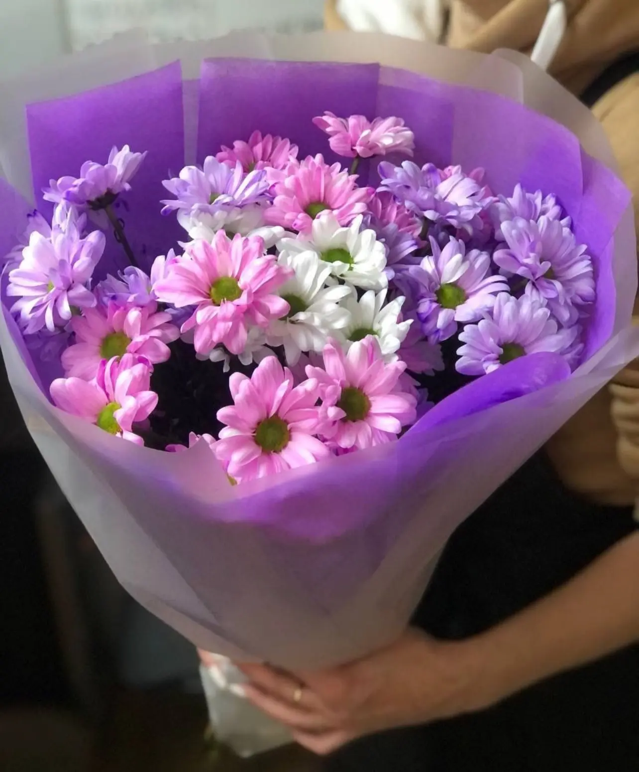 Розовые хризантемы символизируют нежность и теплоту, они дарят радость и создают атмосферу уюта. Их изящные лепестки добавляют в букет нотки романтики и привносят ощущение лёгкости. Фиолетовые хризантемы, в свою очередь, олицетворяют благородство и загадочность. Их глубокий цвет привлекает внимание и подчеркивает индивидуальность композиции.