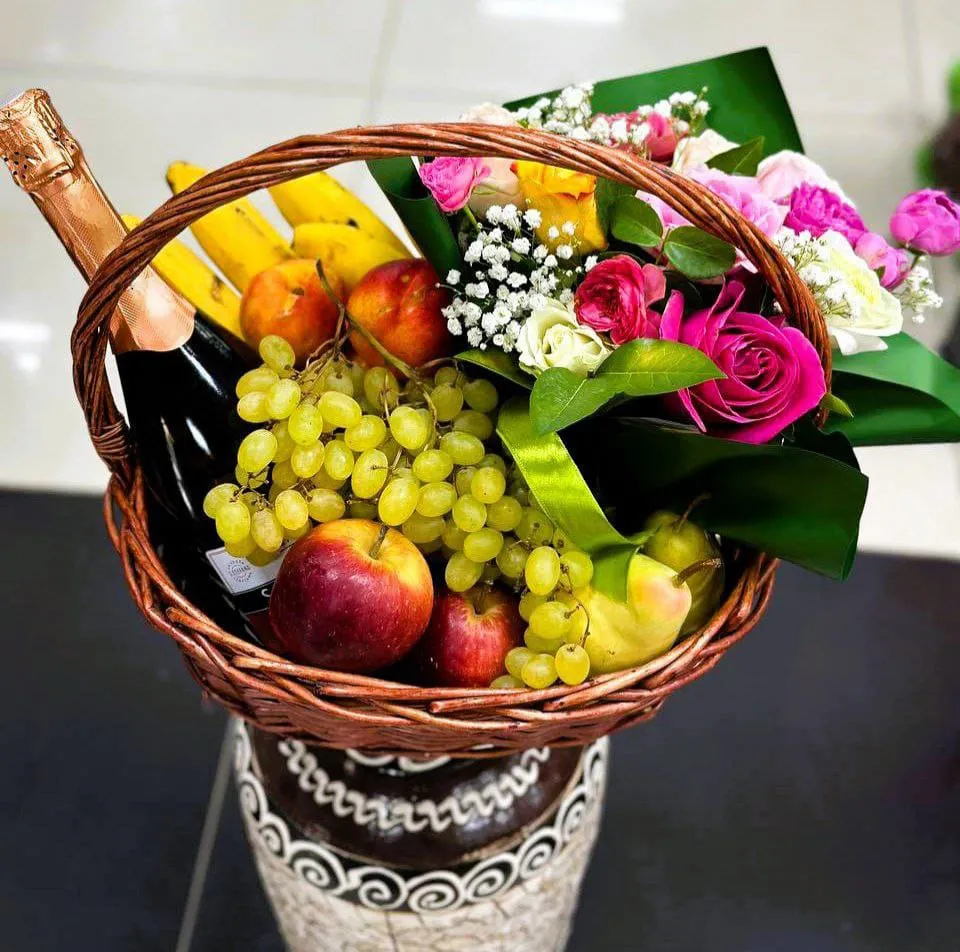 Виноград.яблоки,бананы,груши,напиток (по согласованию)+ цветы |