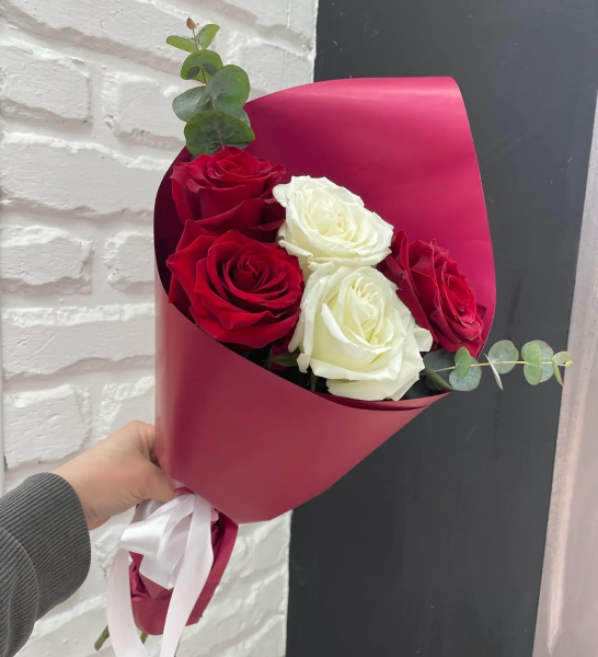 Эффектный букет, в котором сочетаются глубина красных роз и чистота белых, создавая гармоничный контраст чувств - страсти и нежности. Свежие веточки эвкалипта добавляют композиции лёгкость, природную свежесть и утончённый аромат, делая букет ещё более выразительным и стильным.