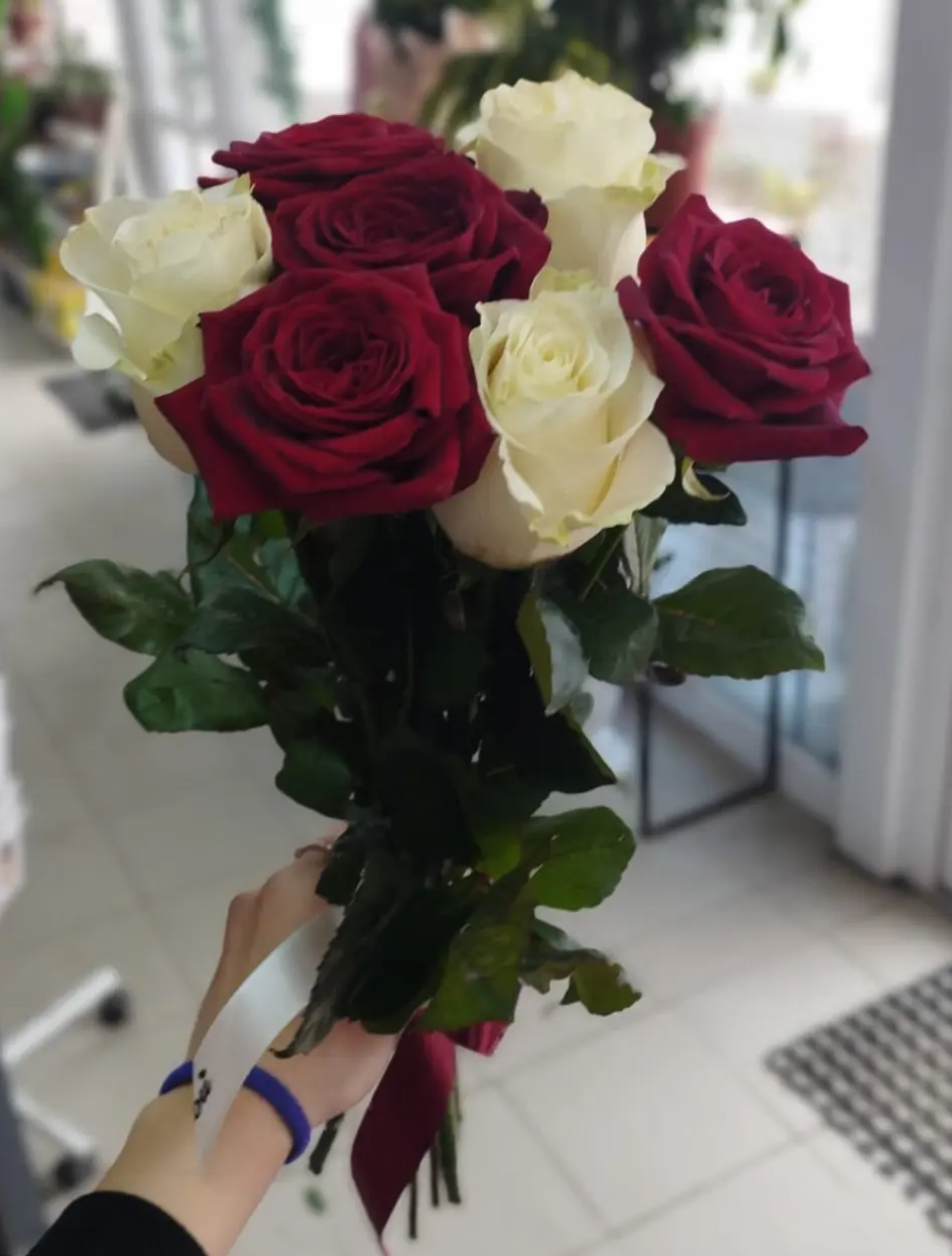 Одноголовые розы - красные и белые,лента |