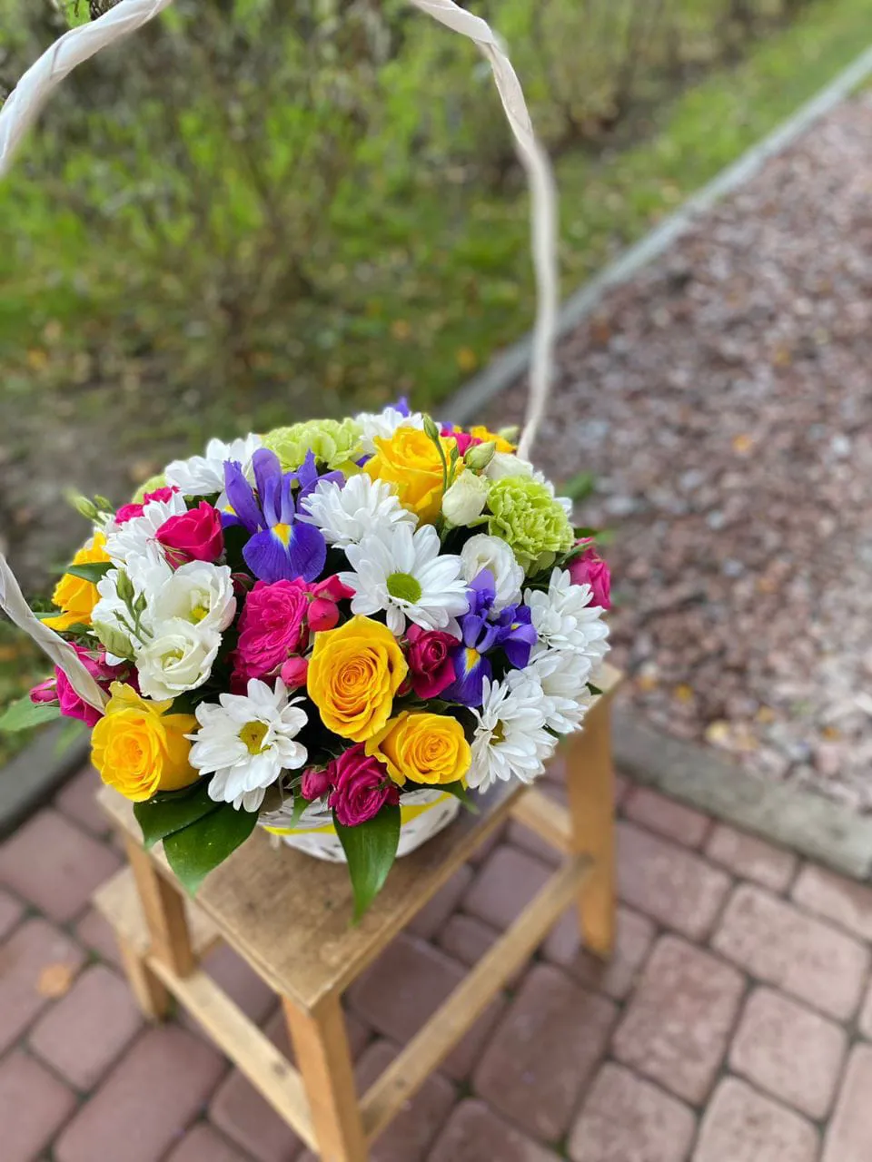 Роза, эустома, хризантема, ирис, гвоздика, салал, оазис, корзина |