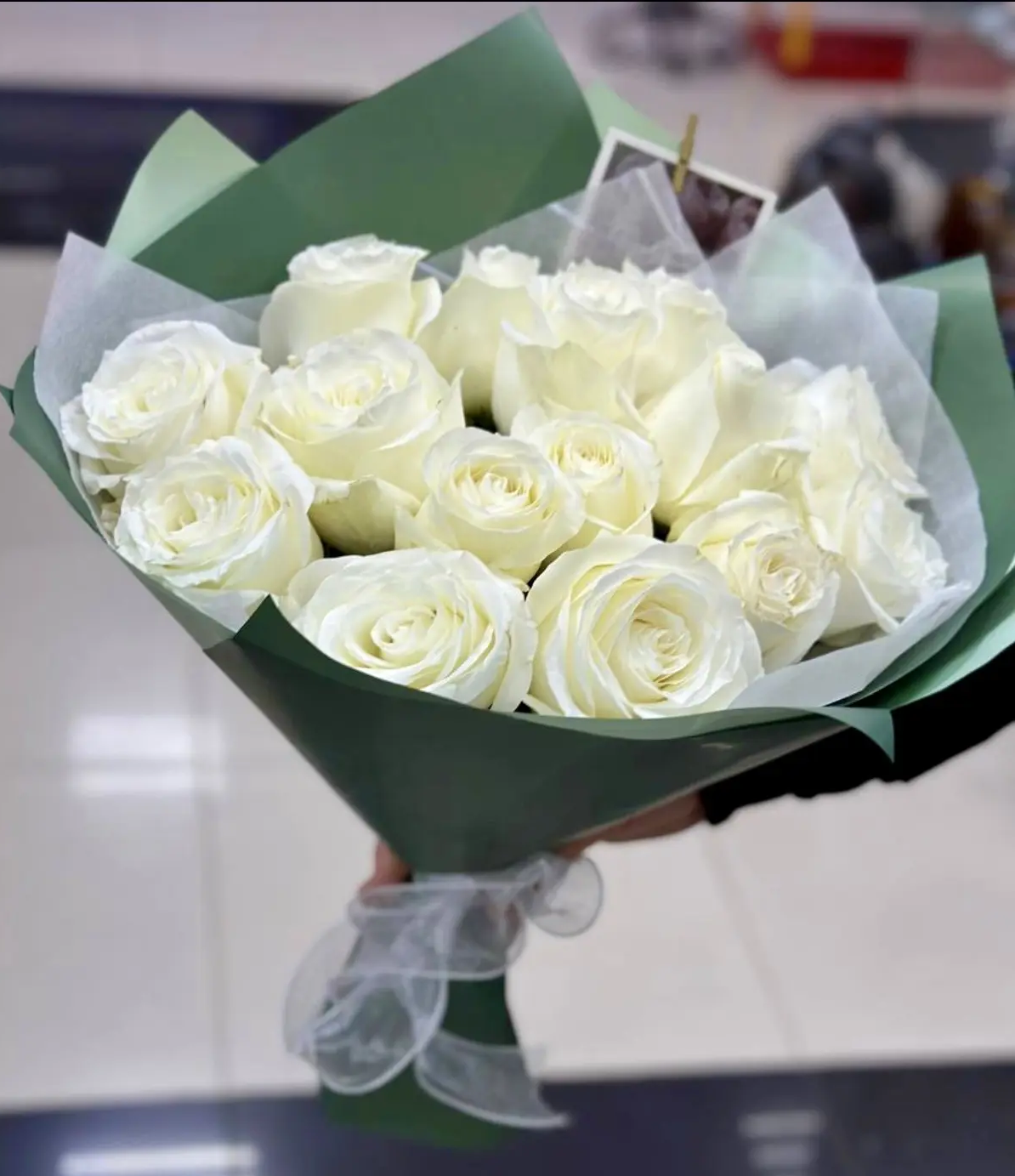 Свежий и элегантный букет из 15 белых роз очаровывает своей чистотой и природной гармонией. Белоснежные бутоны символизируют искренность и светлые чувства, а зелёная упаковка добавляет композиции ощущение свежести, лёгкости и естественной красоты.