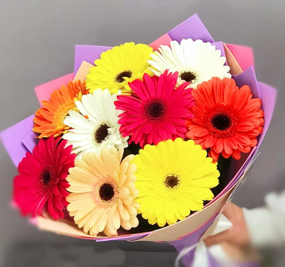 - Премиум - гербера - 9 шт., упаковка, лента