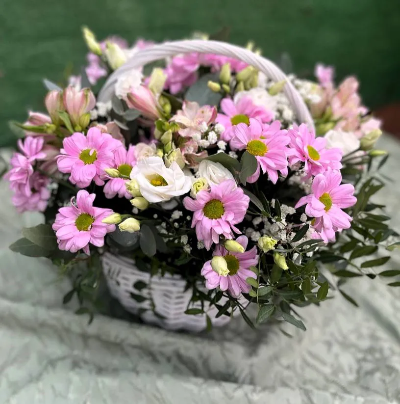 Кустовые хризантемы, эустома, альстромерия, гипсофила, зелень, оазис, корзина |