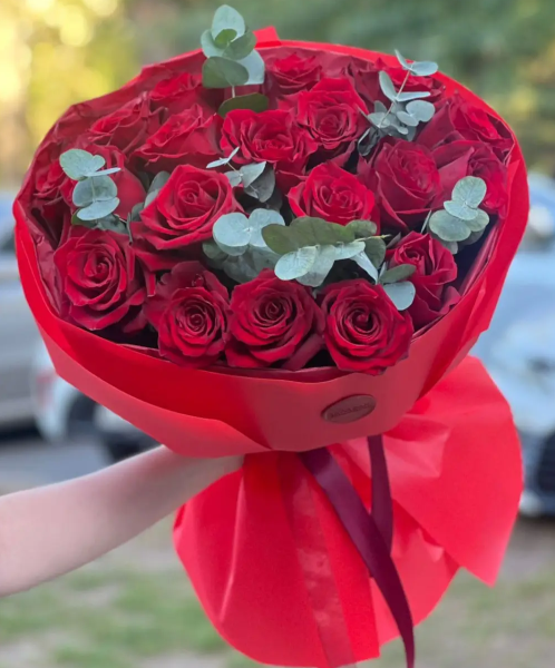 Стильный и выразительный букет, в котором насыщенная красная роза становится символом страсти и глубоких чувств, а свежий эвкалипт добавляет композиции лёгкость и природную утончённость. Красная упаковка усиливает эффект, создавая гармоничный и запоминающийся образ, полный энергии и элегантности.