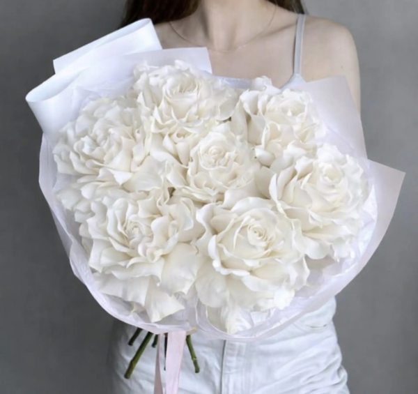 Изысканный букет из белых французских роз воплощает чистоту, утончённость и благородство. Объёмные бутоны с нежными лепестками создают эффект роскоши и лёгкости одновременно, наполняя композицию особым шармом.