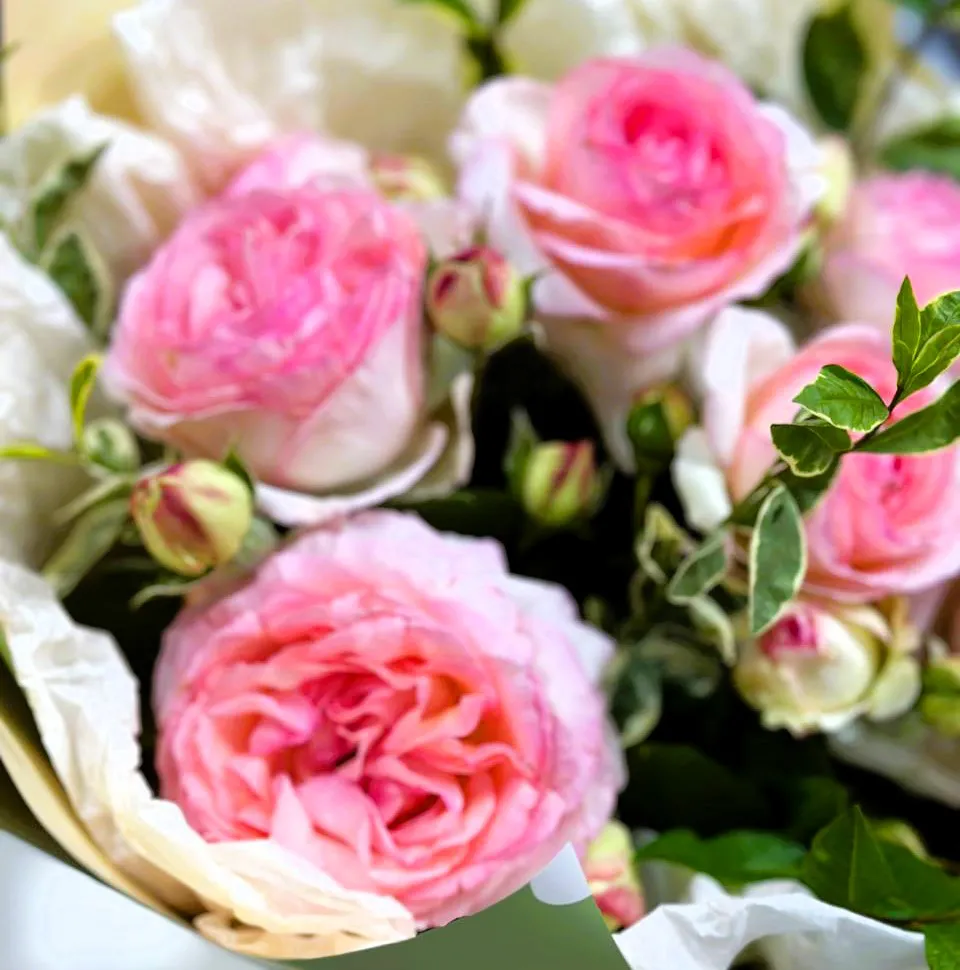 пионовидные одноголовые розы, зелень, упаковка,лента |