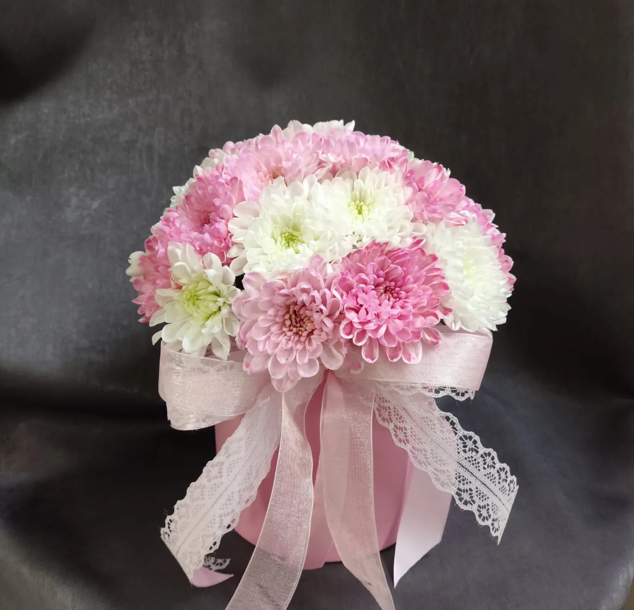 Пусть кустовая хризантема в шляпной коробке станет символом ваших самых искренних чувств и добрых пожеланий!
