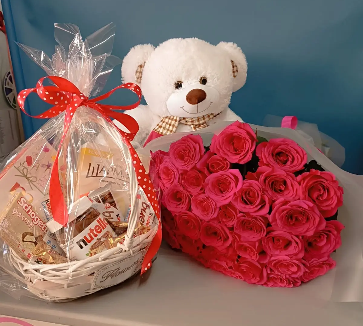 🎁 Подарочный набор: 35 малиновых роз и мягкий мишка 🌹🧸 Сладкую корзину заказать можно отдельно, в набор не входит.