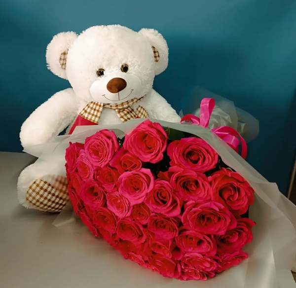 Роскошный букет из 35 малиновых роз в сочетании с милым плюшевым мишкой создаёт идеальный подарок для самых тёплых и искренних эмоций. Ярко, нежно и запоминающе - всё, чтобы по-настоящему удивить.