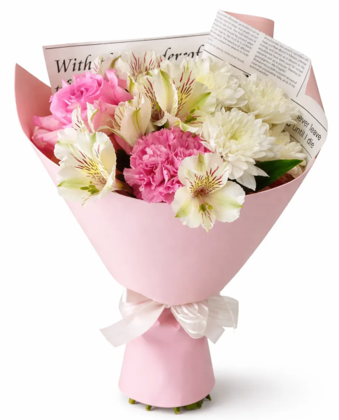 роза,гвоздика,альстромерия, кустовая хризантема, упаковка, лента |