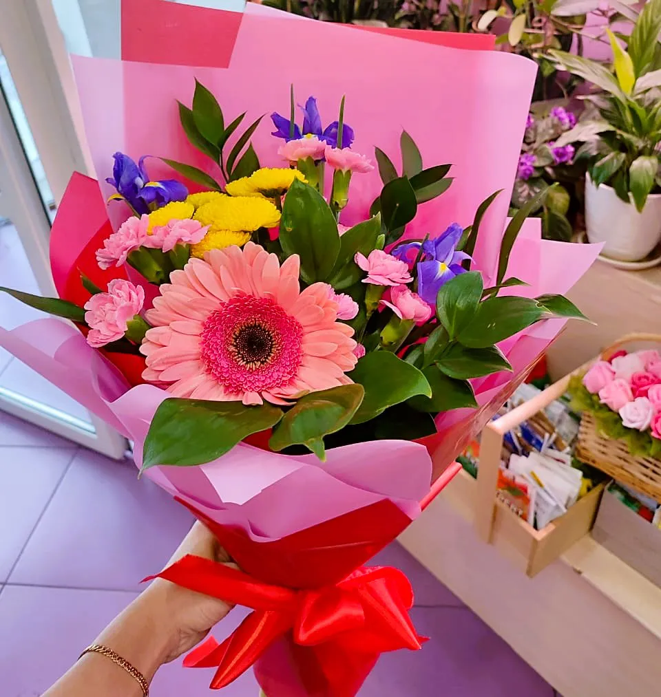 - Премиум - гербера - 4 шт., хризантема 4 шт, гвоздика 5 шт, ирис 7 ш