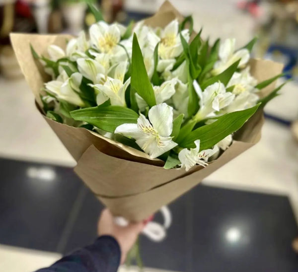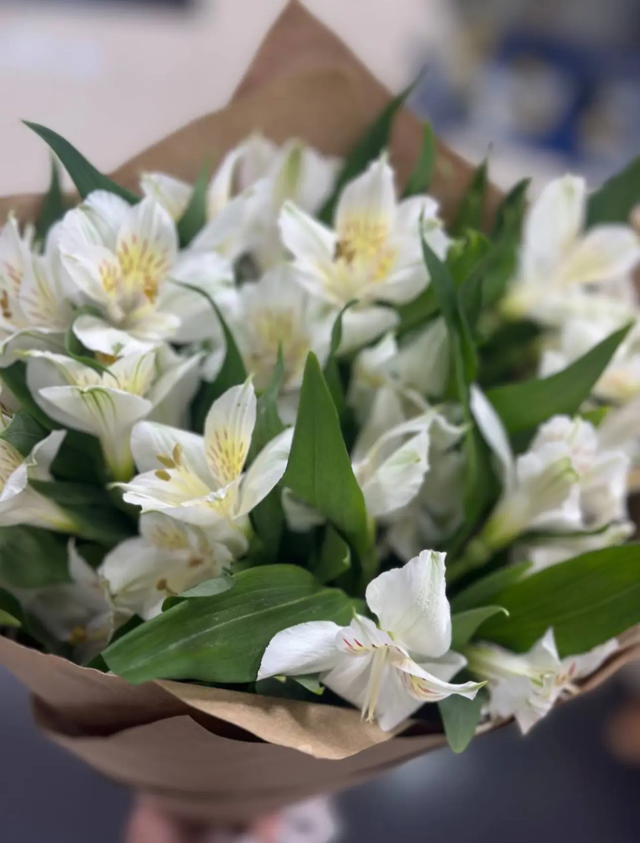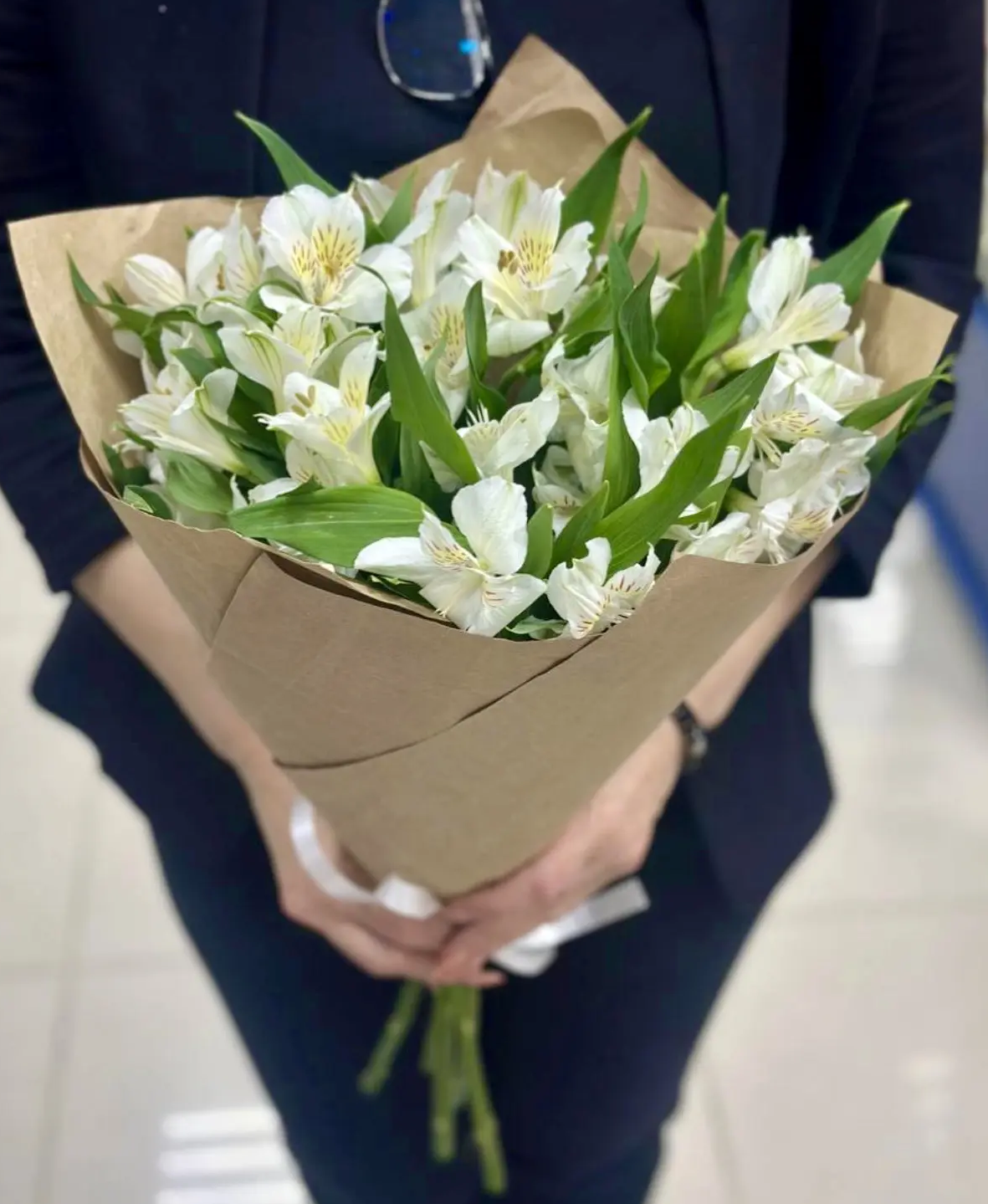 Нежный и изящный букет из белой альстромерии покоряет своей лёгкостью и утончённой красотой. Ажурные лепестки создают воздушную композицию, наполненную светом, свежестью и гармонией. Белый цвет символизирует искренность, чистоту и добрые чувства, делая букет особенно трогательным и универсальным.
