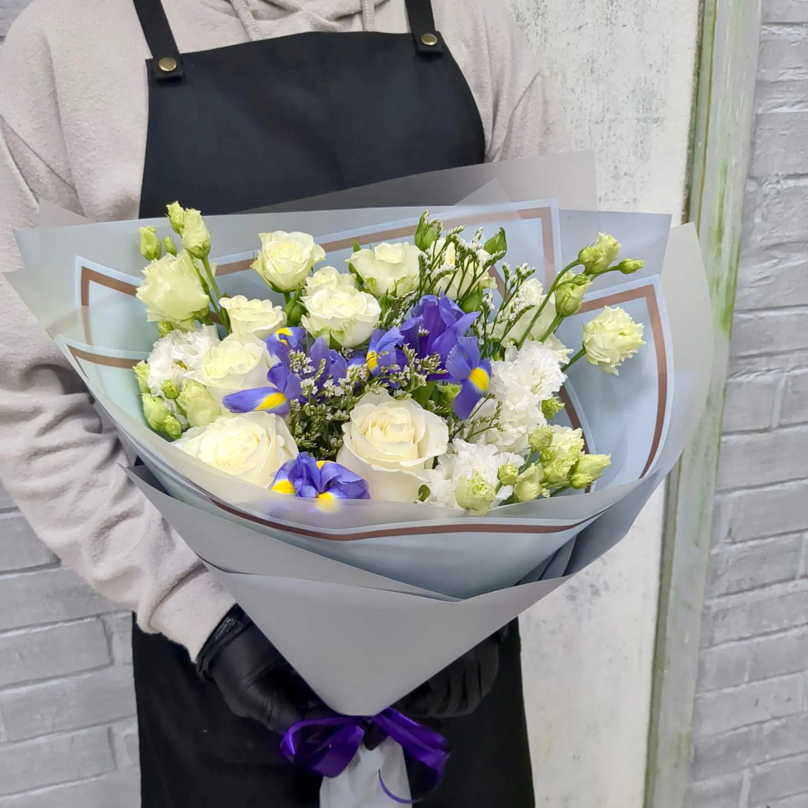 Роза, ирис, эустома, роза кустовая, зелень, упаковка, лента |