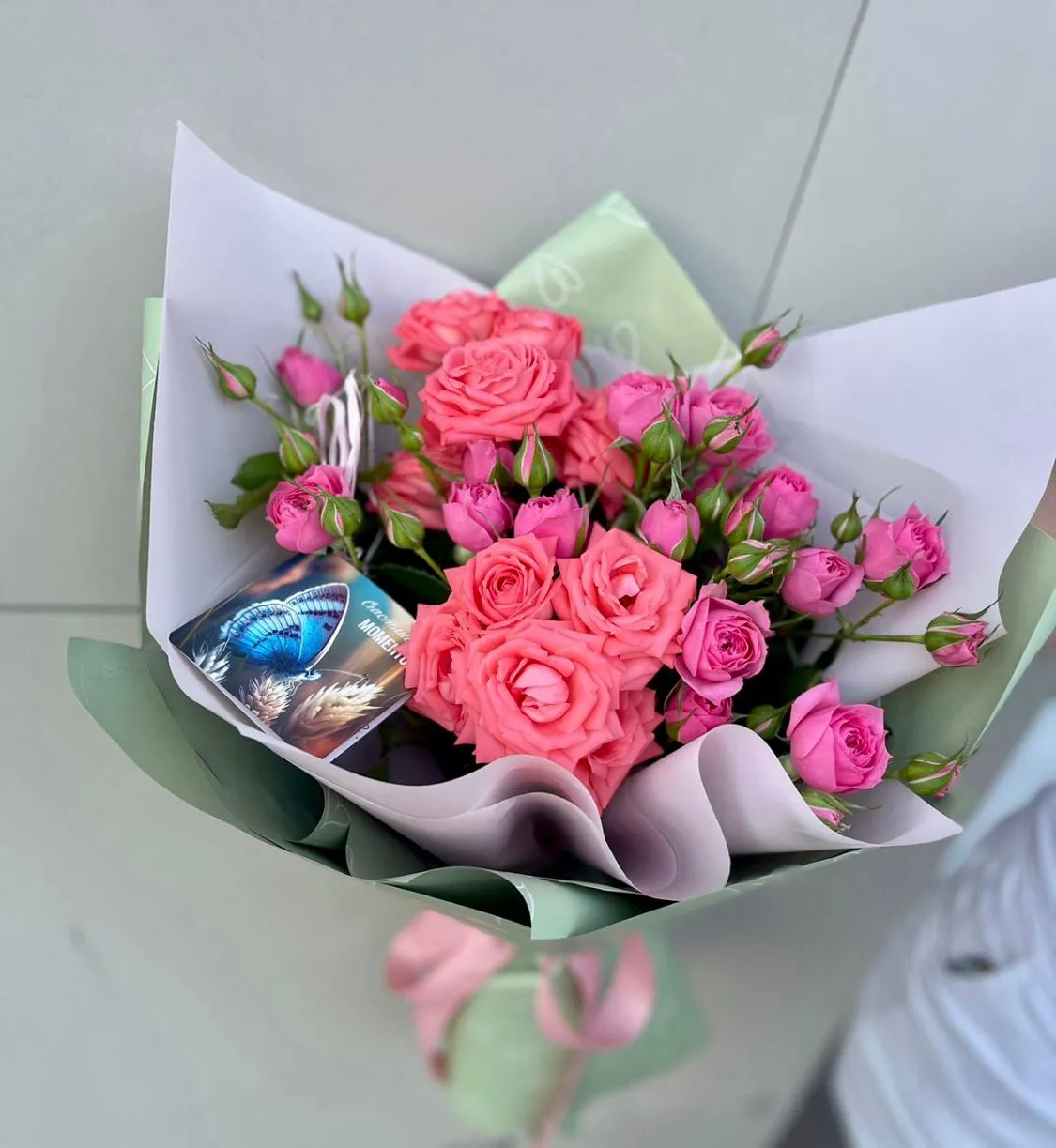 - Средний - роза кустовая - 9 шт., упаковка, лента